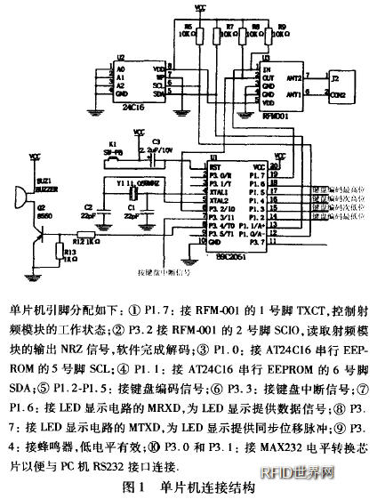 RFM-001射頻模塊只需要2根信號線與單片機連接,ATMEL公司的89C2051滿足端口數(shù)的要求[5],且其工作頻率為1 1.0592MHz,與射頻模塊和RS232匹配.EEPROM采用AT24C16.由MAX232芯片完成UART與RS232的電平轉(zhuǎn)換[6],本系統(tǒng)預(yù)留了RS232接口。方便相關(guān)軟件的開發(fā)和使用,實現(xiàn)單片機與Pc的通信。以便射頻卡讀寫器實時向Pc機傳送信息.
