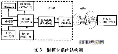 本系統(tǒng)的硬件解決方案中的射頻部分就是利用TIRIS技術(shù),分別選用RFM-001射頻模塊,卡片封裝的RI—TRP—W4FF射頻卡和SA110天線.