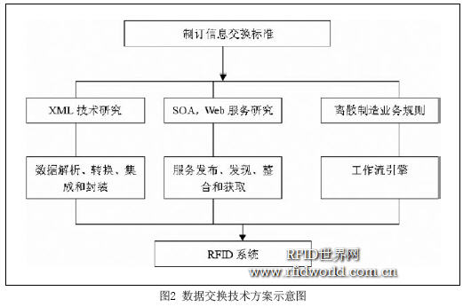 與PDM、ERP 等上層軟件的數(shù)據(jù)融合問題,主要通過理解基于RFID技術(shù)的離散制造業(yè)務(wù)流程和所涉及的動態(tài)數(shù)據(jù),包括:過程數(shù)據(jù)、狀態(tài)數(shù)據(jù)和控制數(shù)據(jù);引入PML技術(shù),研究基于PML的離散制造過程動態(tài)數(shù)據(jù)的封裝、解析和轉(zhuǎn)換,從語義和結(jié)構(gòu)上理解數(shù)據(jù),建立PML到數(shù)據(jù)庫管理系統(tǒng)的映射,為動態(tài)數(shù)據(jù)的管理提供基礎(chǔ)支撐;應(yīng)用SOA架構(gòu)和Web服務(wù)技術(shù),研究離散制造動態(tài)數(shù)據(jù)的采集、發(fā)布、發(fā)現(xiàn)、組合、分發(fā)、獲取等各種服務(wù)實現(xiàn)。數(shù)據(jù)交換技術(shù)的方案如圖2所示。
