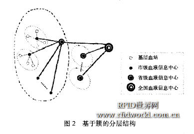 血液跟蹤管理采用基于簇的分層結(jié)構(gòu)。每個簇頭即是一個分布式信息處理中心,用于收集各簇成員的數(shù)據(jù)并完成數(shù)據(jù)的處理與融合,接著將數(shù)據(jù)傳向上一層的簇頭,依次傳遞,最終所有的數(shù)據(jù)經(jīng)過濾和整合后傳向了最高層的簇頭,而其逆過程即是信息的查詢過程,數(shù)據(jù)逐層展開,有序跟蹤。這里,最高層的簇頭就相當于全國的血液信息中心,而次高層的簇頭就相當于各省、自治區(qū)、直轄市的血液信息中心,依次類推,最低層的簇成員便是各基層血站。這種分層結(jié)構(gòu)將信息分散開來,避免了集中存放,解決了信息量過大的問題,也提高了系統(tǒng)的安全性。信息交換與傳遞在子層與父層間直接展開,方便了查詢與跟蹤。結(jié)構(gòu)如圖2所示。