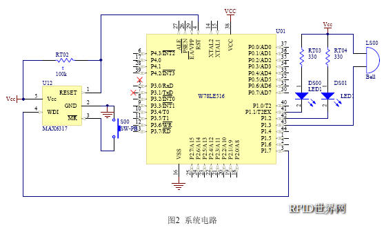 W78E516的P1.1,P1.2各接了一個發(fā)光二極管,P1.3接了一個蜂鳴器,作為各種提示用。W78E516系統(tǒng)電路如圖2所示。