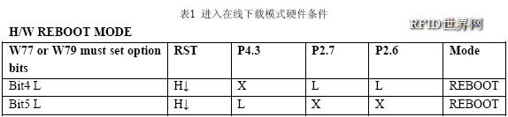 W78E516 內(nèi)建一個64K 字節(jié)的主ROM 區(qū),來存儲應(yīng)用程序(APROM),和一個4K的輔助ROM 區(qū)用于存儲裝載程序(LDROM)。在正常運(yùn)作方式下,控制器執(zhí)行APROM中的代碼。如果要更改APROM 中的代碼,W78E516 允許用戶通過硬件連接方式,來使控制器進(jìn)入在線下載模式即跳轉(zhuǎn)到4K 區(qū)程序執(zhí)行。進(jìn)入在線下載模式硬件條件如下表1:
