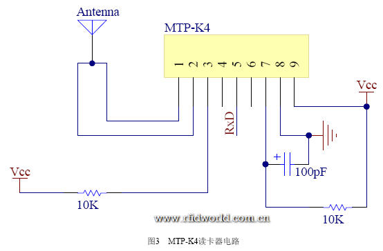 MTP-K4有兩種輸出格式:韋根26位/RS232 TTL(ASCII)。在這里我們使用RS232 TTL(ASCII)輸出格式。MTP-K4總共有9個引腳,引腳3接高為RS232 TTL(ASCII)輸出格式,接低為韋根26位輸出格式。故Pin3在這里接高。天線接在引腳1和引腳2之間。引腳4可接蜂鳴器或者LED,這里把它懸空。引腳5為TX非反相輸出,在這里把它接到CPU的P3.0/RxD管腳上,引腳6為TX反相輸出,這里把它懸空。引腳7低電平復(fù)位,引腳8接地,引腳9接VCC,VCC范圍可從4.6V至5.5V。MTP-K4讀卡器電路如圖2所示。
