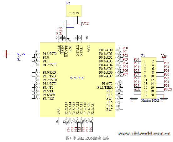 采用此種編程方法可以使我們不用購買專門的編程器就可以隨時對CPU 進(jìn)行編程,而不用對CPU 進(jìn)行插拔。這樣我們就可以使用無鉛封裝QFP44 的W78E516, 減小了板子的大小。另外一塊外置EPROM 板子可以對多塊電路板編程,而且只需使用一次即可,具有簡單,實(shí)用,成本低廉的特點(diǎn)。