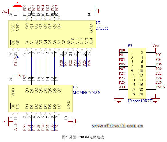 把在線下載程序燒寫到4K LDROM 后,拔掉外置EPROM, 把EA 跳到VCC,使P4.3為低,復(fù)位處理器讓處理器進(jìn)入在線下載模式,在線下載程序通過串口配合上位機(jī)程序從上位機(jī)獲取要執(zhí)行的程序?qū)懭?4K APROM。這樣我們就完成了對64K APROM 的ISP 編程。圖3 為擴(kuò)展EPROM 插座電路圖。圖4 為外置EPROM 電路圖。圖5 為串口的電路連接。