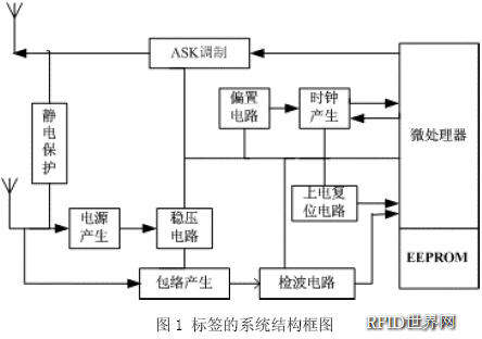 標簽由天線、模擬電路部分、數(shù)字電路部分和EEPROM存儲器組成。圖1示出了標簽的系統(tǒng)結構框圖。天線用于發(fā)射和接收電磁波;模擬電路主要是由包絡檢波電路、ASK調(diào)制電路、穩(wěn)壓電路、時鐘產(chǎn)生電路、偏置電路以及上電復位電路組成,用于獲取能量并調(diào)制解調(diào)信號;數(shù)字電路內(nèi)部包含控制邏輯、微處理器(CPU),用于控制相關協(xié)議、指令及處理功能;EEPROM存儲器用于存儲標簽的系統(tǒng)信息和數(shù)據(jù),存儲時間可以長達幾十年,并且在沒有供電的情況下,其數(shù)據(jù)信息不會丟失。