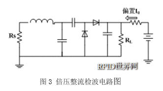包絡檢波電路的作用非常重要,一方面要從射頻輸入端提供的信號提取包絡,并通過檢波電路進行解調(diào),為數(shù)字電路提供數(shù)字基帶信號;另一方面還要從射頻信號中提取穩(wěn)定的偏置電流和時鐘信號,供數(shù)字電路和調(diào)制電路使用。本論文設計了一種倍壓整流檢波電路,其等效電路圖如圖3所示,其中Rs為封裝電路的等效串聯(lián)電阻,RL為負載電阻。