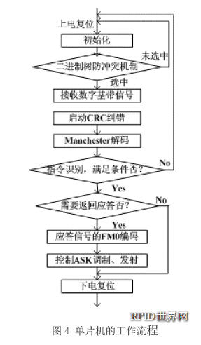 單片機的工作流程如圖4所示,①當標簽進入閱讀器的射頻場后,芯片上電復位;②單片機完成初始化;③啟動二進制樹防沖突單元,讀取“Select”標志位,如果等待一定時間后未被選中,則返回①狀態(tài),繼續(xù)等待,如果收到“選中”指令,則繼續(xù)下一步;④接收檢波電路送來的數(shù)字基帶信號;⑤啟動CRC糾錯電路;⑥對基帶信號進行Manchester解碼;⑦對信號中的指令進行識別,如果發(fā)現(xiàn)滿足指令執(zhí)行的條件,就執(zhí)行閱讀器指定的操作,并根據(jù)通信協(xié)議,決定是否返回應答信號,反之,則向閱讀器發(fā)出出錯信息,并將工作狀態(tài)返回至初始狀態(tài);⑧對應答信號進行FM0編碼;⑨控制射頻端的ASK調(diào)制和發(fā)射;⑩保持一定時間的靜默后,進入下電復位狀態(tài)。