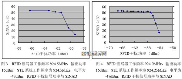 備,使RFID 讀寫器工作在924.5MHz 和924.0MHz,不同的功率級別,分別記錄相應(yīng)的綜測儀的SINAD