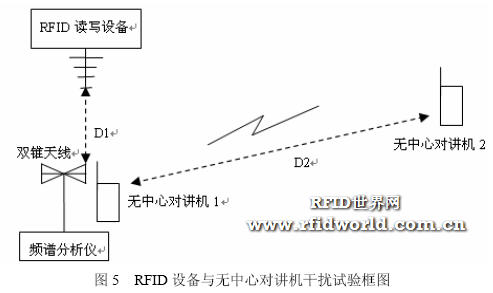 RFID 設(shè)備不會對無中心對講機(jī)產(chǎn)生明顯干擾。在滿足帶外發(fā)射在GSM 下行頻段的功率譜密度小于-