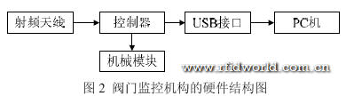 本設(shè)計(jì)的硬件包括了機(jī)械動(dòng)作模塊、射頻天線模塊、控制器模塊和USB 接口模塊等四個(gè)部分[1],如圖2 所示: