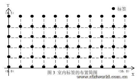 圖3 為室內標簽布置簡圖,把他們用坐標軸劃分成格子形式,他們之間的間隔距離為1米,如圖每個標簽的坐標都已知,當裝有讀寫器的移動機器人在該區(qū)域內運動,就可以讀取到格子內鄰近的4 個標簽,通過標簽的信息進而得知鄰近4 個坐標值,根據(jù)RSSI 得到與標簽的相對距離就可以計算出機器人的坐標位置,如圖2。