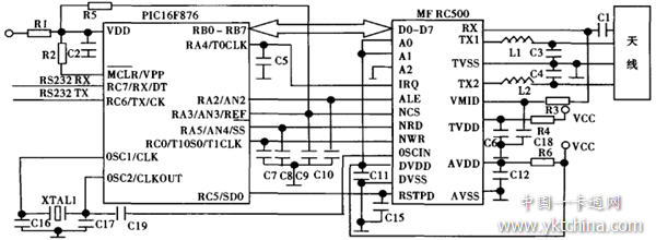 圖2所示為IC卡讀寫器的硬件連接圖。系統(tǒng)所使用的硬件主要由2部分組成:PIC16F876單片機與芯片MF RC500組成。該系統(tǒng)采用PIC16F876單片機為控制核心,主要完成數(shù)據(jù)采集、處理、存儲及控制系統(tǒng)工作的功能,通過RB El與MF RC500的數(shù)據(jù)總線相連,可實現(xiàn)與非接觸式IC卡數(shù)據(jù)的無線傳輸。RC7、RC6用來連接RS232,最終與計算機相連。RK3作為MF RC500的片選端,低電平有效。RK5、RC0分別控制MF RC500的讀寫,RA4接收來自非接觸式IC卡的中斷請求并執(zhí)行中斷程序。該系統(tǒng)的工作頻率為13.56 MHz,由石英晶體振蕩器產(chǎn)生,用于給MF RC500提供時鐘信號,同時也驅動天線基頻載波信號。MFRC500是與非接觸式IC卡實現(xiàn)無線通信的核心模塊,也是IC卡讀寫器讀寫非接觸式IC卡的關鍵接口芯片。它根據(jù)寄存器的設定對發(fā)送緩沖區(qū)中的數(shù)據(jù)進行調制,得到發(fā)送的信號,通過由TX1、TX2腳驅動的天線以電磁波的形式發(fā)出去,非接觸式IC卡采用RF場的負載調制進行響應。MF1卡放在距離射頻天線100mm內,天線拾取非接觸式IC卡的響應信號,經(jīng)過天線匹配電路送到RX腳,MF RC500內部接收緩沖器對信號進行檢測和解調,并根據(jù)寄存器的設定進行處理。處理后的數(shù)據(jù)發(fā)送到并行接口由單片機讀取。