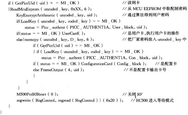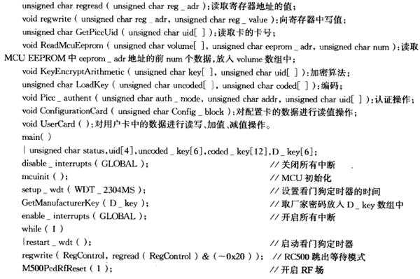 程序采用標準C語言編制,以PCW C Compiler IDE編譯器為開發(fā)環(huán)境,以下是部分程序源代碼以及子函數(shù)說明。該程序代碼在PIC16F876單片機上測試通過。程序將RF場適時的開啟與關閉,大大降低了MCU與RF場的功耗,同時減少了在讀卡過程中MF RC500對MCU的干擾。