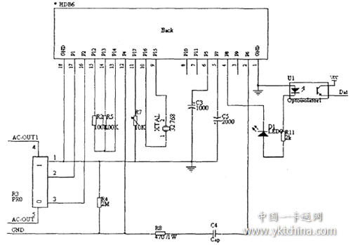 在HDB6的電路中采用高精度的手表晶體諧振器作為時(shí)鐘基準(zhǔn)源。在電能表正常工作時(shí)要求該晶體必須穩(wěn)定可靠的工作。也就是說(shuō)在長(zhǎng)時(shí)間工作中,晶體必須保持在一定的振蕩幅度范圍內(nèi),若晶體出現(xiàn)老化將導(dǎo)致頻率漂移、停振而影響電能表的正常工作。在設(shè)計(jì)中使用的是諧振頻率為32768Hz的晶體振蕩器。接在11腳的R,用來(lái)調(diào)整電能表輸出的相對(duì)誤差,只要選取適當(dāng)?shù)淖柚当憧墒勾穗娐返南鄬?duì)誤差控制在規(guī)定范圍內(nèi)。在實(shí)際應(yīng)用前,通過(guò)比較功率表與測(cè)量的功率值,手動(dòng)調(diào)整R,來(lái)實(shí)現(xiàn)測(cè)量模塊的精度。