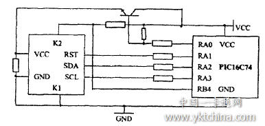 IC卡讀寫(xiě)接口電路主要由IC卡卡槽和保護(hù)電路構(gòu)成。當(dāng)卡插入卡槽時(shí),各引腳一一相連,實(shí)現(xiàn)了PIC單片機(jī)和IC卡的串行通信,并對(duì)插卡進(jìn)行保護(hù),硬件電路圖如圖3所示。與SLE4442相連3個(gè)I/0 口(RST,CLK,t/o)均需接上拉電阻,若選用的單片機(jī)I/0口內(nèi)有上拉電阻,則可以省去;也可以加鉗位保護(hù)二極管,抑制由于線路干擾和邏輯電平變化的邊沿抖動(dòng)所帶來(lái)的瞬態(tài)過(guò)壓。在電壓穩(wěn)定、干擾很小的情況下,可以不加。