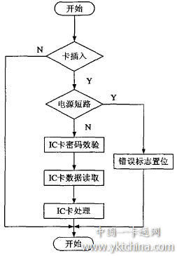 IC卡檢測(cè)流程采用了模塊化設(shè)計(jì)。首先檢測(cè)是否有IC卡插入。在正確插入的前提下。對(duì)IC卡進(jìn)行密碼校驗(yàn)。讀取IC卡存儲(chǔ)單元中的內(nèi)容后。對(duì)卡進(jìn)行鑒別,識(shí)別出是哪一類(lèi)型的卡,其中包括初始化卡、定量卡、清零卡、用戶卡四種類(lèi)型。根據(jù)鑒別結(jié)果進(jìn)行相應(yīng)的處理。圖6為IC卡檢測(cè)流程圖。