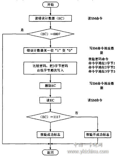 本智能IC卡電能表數(shù)據(jù)加密是通過(guò)對(duì)密碼存儲(chǔ)器的操作實(shí)現(xiàn)的。通過(guò)校驗(yàn)密碼校驗(yàn)輸入密碼與芯片內(nèi)的密碼是否相符。若相符則對(duì)主存儲(chǔ)器的寫(xiě)操作使能,以及對(duì)密碼存儲(chǔ)器的讀寫(xiě)使能;若錯(cuò)誤,計(jì)數(shù)器則將失敗的校驗(yàn)次數(shù)記錄下來(lái)。為了防止通過(guò)多次校驗(yàn)以獲取密碼的可能性。設(shè)計(jì)了連續(xù)3次錯(cuò)誤校驗(yàn)芯片自鎖功能。 圖7是密碼校驗(yàn)的程序框圖。