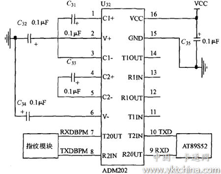 由于BPM02是RS232接口,所以使用了一片MAX2O2作為電平轉換芯片,實現其與單片機的通信。如圖3所示。