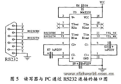 讀寫器與上位機的通信采用RS一232方式。單片機STC89C52RC 與PC 串口電平不匹配,使用MAX232型電平轉(zhuǎn)換器進行電平轉(zhuǎn)換。接口電路如圖5所示。