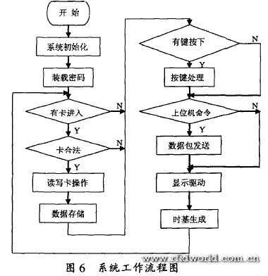 讀寫卡過程包括裝載密碼、詢卡、防沖突、選卡、驗證密碼、讀寫卡和停卡。這一系列操作必須按固定的順序進行。在沒有射頻卡進入射頻天線有效范圍時,在低5位顯示當前時鐘;當有射頻卡進入到射頻天線的有效范圍,讀卡程序驗證卡及密碼成功后.將卡號和讀卡時間及相關(guān)數(shù)據(jù)作為一條記錄存入EEP—ROM存儲器中,并在LED顯示器高5位上顯示卡號。
