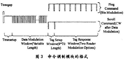 命令調(diào)制模塊發(fā)送的命令必須符合EPC規(guī)范對信息編碼要求以及命令格式要求。信息編碼占空比為1/8時(shí)鐘表示“0”,占空比為3/8時(shí)鐘表示“l(fā)”。命令格式要求如圖3所示,根據(jù)EPC規(guī)范,可以將命令格式分為3種,分別為ping命令格式、寫卡(program)命令格式、讀卡(scrolled)命令格式,具體命令格式參照文獻(xiàn)[1]。命令調(diào)制模塊實(shí)現(xiàn)3種命令格式的調(diào)制。命令調(diào)制模塊設(shè)計(jì)采