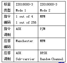 在RFID的各標(biāo)準(zhǔn)中,都存在一些較為特殊的定義,如Mode1支持兩種指令編碼,其應(yīng)答信號是具有副載波二次調(diào)制的ASK;Mode2的指令調(diào)制為±1°~±2°的相位跳動(dòng)調(diào)制,其應(yīng)答調(diào)制為在8個(gè)可選通道中隨機(jī)選擇一個(gè)通道的BPSK。