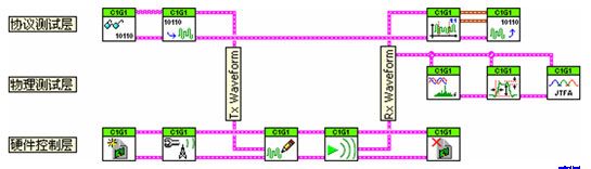 強(qiáng)大的測試軟件是虛擬儀器技術(shù)的關(guān)鍵,如前所述,該系統(tǒng)突破了傳統(tǒng)儀器受專有硬件限制的局限性,在軟件層實(shí)現(xiàn)了對RFID多標(biāo)準(zhǔn)的支持。結(jié)合NI模塊化硬件提供靈活的平臺(tái),我們采用了層次化、模塊化的軟件構(gòu)架,從而使系統(tǒng)功能適應(yīng)RFID的測試需求。雖然RFID的各種標(biāo)準(zhǔn)之間,其編碼/解碼、調(diào)制/解調(diào)過程的具體實(shí)現(xiàn)方式都不盡相同,但通過模塊化的良好封裝,頂層的功能模塊都以統(tǒng)一的標(biāo)準(zhǔn)接口呈現(xiàn)給用戶。這樣使得現(xiàn)已支持的標(biāo)準(zhǔn)都能夠很好的整合在一起,并且為將來可能擴(kuò)展的新標(biāo)準(zhǔn)支持提供了非常方便的接口。