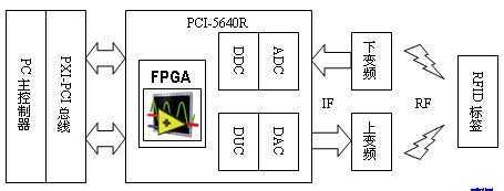 該系統(tǒng)構(gòu)架由第一代系統(tǒng)改進(jìn)而來,第二代超高頻RFID標(biāo)準(zhǔn)需要在應(yīng)答器和標(biāo)簽之間建立微秒級實(shí)時(shí)通訊,因此我們采用IF RIO結(jié)合上、下變頻器來實(shí)現(xiàn)實(shí)時(shí)通訊過程,板載FPGA用于建立實(shí)時(shí)通訊,HOST處理器用于信號的后續(xù)分析。