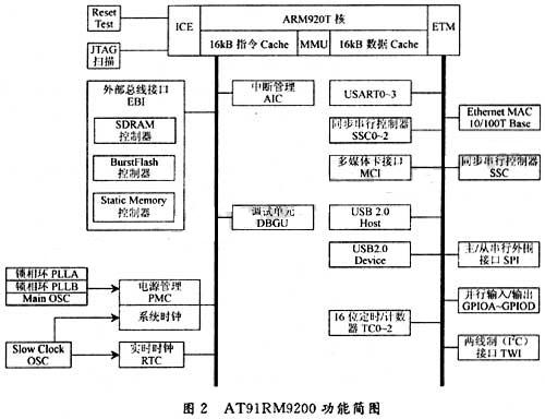 嵌入式微處理器是整個(gè)嵌入式系統(tǒng)的核心,AT91RM9200是Atmel公司推出的基于當(dāng)前流行的ARM920T內(nèi)核的一款32位RISC微控制器,工作在180MHz頻率下的運(yùn)算速度可達(dá)200MIPS。專門針對(duì)系統(tǒng)控制、通訊領(lǐng)域的應(yīng)用。AT91RM9200芯片的功能結(jié)構(gòu)如圖2所示。