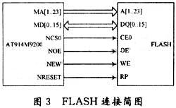 (1)本設(shè)計(jì)選用1片8M×16b數(shù)據(jù)寬度的FLASH,共16MB,作為程序代碼存儲(chǔ)器和信號(hào)機(jī)運(yùn)行時(shí)的永久數(shù)據(jù)存儲(chǔ)器。FLASH存儲(chǔ)器在系統(tǒng)中主要用于存放引導(dǎo)程序bootloader、操作系統(tǒng)內(nèi)核鏡像和應(yīng)用程序代碼等,系統(tǒng)上電或者復(fù)位后從FLASH中運(yùn)行bootloader,由bootloader初始化硬件并將操作系統(tǒng)拷貝到SDRAM中去執(zhí)行。所以將FLASH存儲(chǔ)器分配到AT91RM9200的BANK0(存儲(chǔ)區(qū)域1)地址空間,即將AT91RM9200的NCSO連接到FLASH的片選端CE0。FLASH輸出使能端OE接AT91RM9200的NOE;寫使能端WE接AT91RM9200的NWE;模式選擇端BYTE上接高電平,使FLASH工作在16位數(shù)據(jù)模塊,16位模塊FLASH與AT91RM9200的基本連接如圖3所示。