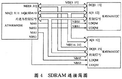 (2)為了提高系統(tǒng)運(yùn)行的效果,系統(tǒng)啟動(dòng)后將FLASH中代碼拷貝到SDRAM中,由SDRAM作系統(tǒng)程序運(yùn)行場(chǎng)所。為了發(fā)揮AT91RM9200處理器32位數(shù)據(jù)處理性能,本設(shè)計(jì)選用2片4BANK×4M×16b(32MB)SDRAM,并聯(lián)組成32b的RAM,總共64MB空間,完全可以滿足嵌入式操作系統(tǒng)及各種復(fù)雜功能的運(yùn)行要求。