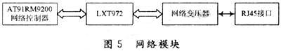 LXT972和AT91RM9200網(wǎng)絡(luò)控制器通過介質(zhì)無(wú)關(guān)接口(MII)可以很方便地連接。在LXT972和RJ45接口之間需要用網(wǎng)絡(luò)隔離變壓器來(lái)連接,網(wǎng)絡(luò)隔離變壓器起信號(hào)傳輸、阻抗匹配、波形修復(fù)、雜波抑制以及高電壓隔離等作用,以保護(hù)系統(tǒng)的安全。LXT972的RX+/RX-、TX+/TX-接到網(wǎng)絡(luò)隔離變壓器上,再由變壓器引出相應(yīng)信號(hào)連接到RJ45接口上,網(wǎng)絡(luò)模塊以標(biāo)準(zhǔn)RJ45接口與以太網(wǎng)相連。其網(wǎng)絡(luò)模塊連接方式如圖5所示。