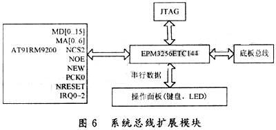 信號(hào)機(jī)使用操作面板的小鍵盤進(jìn)行參數(shù)設(shè)置和方案設(shè)定,并用LED模塊顯示信號(hào)燈閃爍。操作面板的鍵盤、LED設(shè)計(jì)采用“串行”操作,即面板的鍵盤信號(hào)先進(jìn)行“并/串”轉(zhuǎn)換后,以兩線同步串行方式傳輸?shù)娇刂瓢宓腃PLD,作“串/并”轉(zhuǎn)換后再發(fā)送給AT91RM9200。在操作面板自己的CPLD內(nèi),模塊“8279”的工作方式,采集鍵盤信號(hào),同樣AT91RM9200發(fā)送給LED顯示的命令數(shù)據(jù)先在CPLD中實(shí)現(xiàn)“并/串”轉(zhuǎn)換,以兩線同步串行方式,傳輸給操作面板,由操作面板的CPLD處理后控制LED。這種方案大大減少控制主板與操作面板之間的聯(lián)線,模塊化程度更好。系統(tǒng)總線擴(kuò)展模塊如圖6所示。