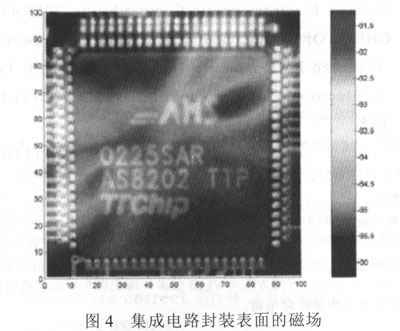圖4給出了集成電路封裝表面磁場掃描的示意圖。從圖中可以明顯地看出具有較高的磁場強度元件的區(qū)域。由于高短路電流與高動態(tài)轉(zhuǎn)換電流結(jié)合,故具有較高磁場輻射的管腳通常是集成電路的電源供應(yīng)管腳和負載輸出管腳。正是由于整個集成電路的電磁輻射主要集中在這些管腳上,所以電磁兼容性測量就應(yīng)該從這里著手。