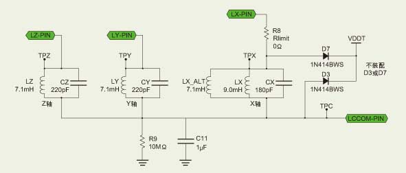 PIC16F639器件具有三個低頻輸入通道。LCX、LCY和LCZ引腳用于連接(每個LF輸入通道的)外部LC諧振天線電路。外部電路連接至天線輸入引腳及LCCOM引腳。對所有外部天線電路而言,LCCOM是共用引腳。當(dāng)內(nèi)部檢測電路檢測到強輸入信號時,建議在LCCOM引腳與地之間接一個電容(1~10μF),以提供穩(wěn)定的工作狀態(tài)。