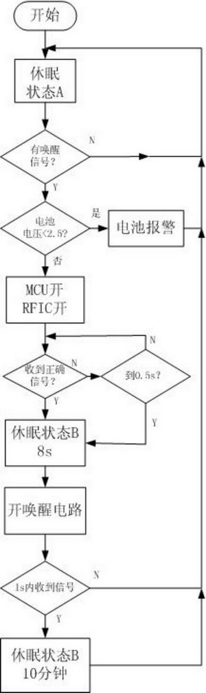 電子標(biāo)簽平時(shí)處于休眠狀態(tài),當(dāng)喚醒電路接收到433MHz射頻信號(hào)時(shí),向MCU發(fā)出喚醒信號(hào),MCU被喚醒,立即喚醒RF模塊,進(jìn)入接收狀態(tài),檢測(cè)RF模塊有無(wú)信號(hào),如無(wú)信號(hào),標(biāo)識(shí)電池電量不足。接收到正確信號(hào)后,MCU關(guān)閉RF模塊,使其進(jìn)入休眠狀態(tài),并關(guān)閉喚醒電路,設(shè)定8s延時(shí),防止在同一標(biāo)識(shí)區(qū)重復(fù)喚醒,MCU進(jìn)入休眠狀態(tài),定時(shí)喚醒后,MCU打開(kāi)喚醒電路,進(jìn)入下一次接收狀態(tài)。當(dāng)1s內(nèi)接收到喚醒信號(hào),則再設(shè)10分鐘延時(shí),關(guān)閉喚醒電路,防止在同一標(biāo)識(shí)區(qū)重復(fù)喚醒,在此期間MCU和RFID處于休眠狀態(tài)。然后進(jìn)入接收狀態(tài)。流程圖如圖4。