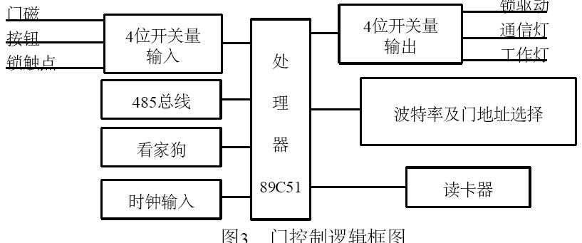 門控部分包括讀卡器及控制電路、帶觸點(diǎn)的陰陽(yáng)鎖、電源、門磁開(kāi)關(guān)、出門按鈕。其邏輯框圖如圖3 所示。