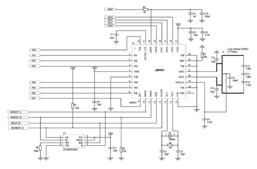 圖2是有源標(biāo)簽的基本框圖,其中電池可采用普通的3V紐扣電池,圖3是射頻收發(fā)電路的原理圖,ANT1和ANT2為天線連接引腳,采用PCB環(huán)形差分天線,可以進(jìn)一步減小標(biāo)簽的體積。25320為EEPROM,在nRF9E5上電后,系統(tǒng)根據(jù)引導(dǎo)程序,把25320中的程序代碼拷貝到nRF9E5的4KB RAM中。晶振工作頻率為16MHz,為了得到精確的內(nèi)部偏置電壓,通常在引腳IREF和地之間接一個阻值為22kΩ,誤差為1%的電阻。
