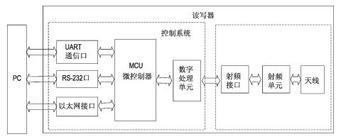 RFID讀寫器的任務(wù)是控制射頻模塊向標(biāo)簽發(fā)射讀取信號,并接收標(biāo)簽的應(yīng)答,對標(biāo)簽的對象標(biāo)識信息進(jìn)行解碼,將對象標(biāo)識信息連帶標(biāo)簽上其他相關(guān)信息傳輸?shù)街鳈C(jī)以供處理。讀寫器基本結(jié)構(gòu)如圖4所示,可以將讀寫器簡化為控制系統(tǒng)和由射頻收發(fā)器組成的射頻模塊兩個基本的功能塊。