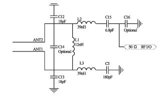 在所設(shè)計(jì)的系統(tǒng)中,讀寫器中的射頻模塊與有源標(biāo)簽中的射頻模塊電路類似,只是為了更有效地傳輸射頻信號,采用單端連接的50Ω阻抗天線,需要在芯片天線連接引腳和天線之間加一個匹配網(wǎng)絡(luò),如圖5所示。