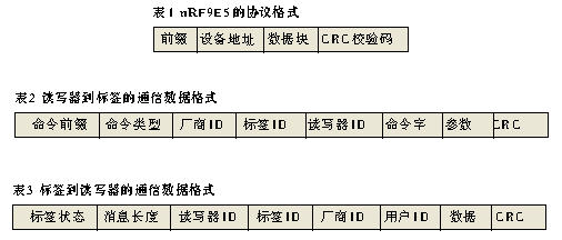 由于讀寫器與標(biāo)簽之間的通信可能會受到其他數(shù)據(jù)終端或外界環(huán)境的干擾而發(fā)生錯誤,因此,需要通信協(xié)議來保證數(shù)據(jù)傳輸?shù)目煽啃浴RF9E5的協(xié)議格式參見表1,其中,前綴就是數(shù)據(jù)頭,設(shè)備地址包括讀寫器地址和標(biāo)簽地址,CRC校驗(yàn)碼可選為8位或16位。