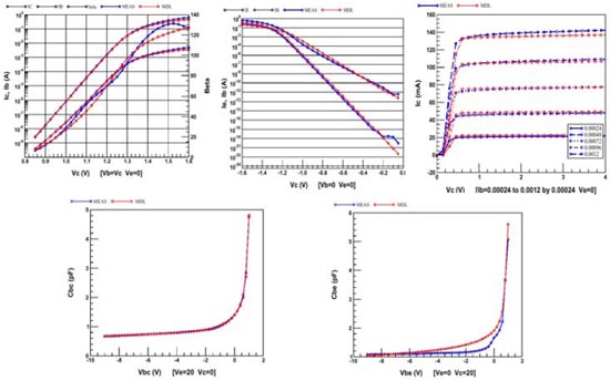 圖2:正向、反向Gummel、I/V和CV特征的比較,其中TCAD數(shù)據(jù)為藍(lán)色,模型數(shù)據(jù)為紅色。