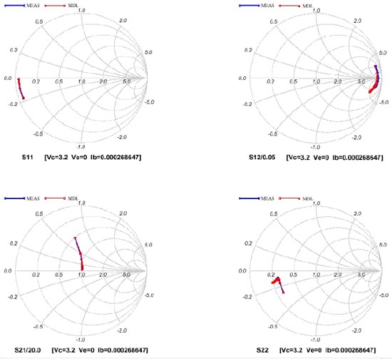 TCAD數(shù)據(jù)顯示為藍(lán)色,模型數(shù)據(jù)顯示為紅色。兩者相符顯示該模型準(zhǔn)確地反映了原始的TCAD數(shù)據(jù)。圖3顯示的是S特征參數(shù)的比較。良好的匹配再次表明該模型準(zhǔn)確地反映了TCAD數(shù)據(jù)。