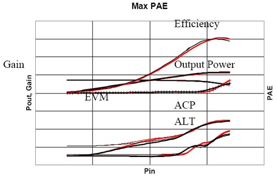 該功率掃描圖顯示了效率、輸出功率和增益的出色預(yù)測。此外,比較還顯示了線性誤差矢量幅度(EVM)、鄰信道功率(ACP)和相間信道功率(ALT)的測量結(jié)果。這些測量顯示,增益和相位關(guān)系得到了很好的仿真。對于目前的無線通信器件設(shè)計來說,線性特征、EVM、ACP和ALT的準(zhǔn)確預(yù)測非常重要。