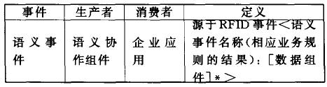 表2 語義事件定義語義協(xié)作組件負責將RFID事件轉(zhuǎn)換為語義事件。轉(zhuǎn)換過程是這樣的,對RFID事件進行收集,獲取相關(guān)的數(shù)據(jù),分析相應(yīng)的業(yè)務(wù)規(guī)則,最終產(chǎn)生語義事件。為產(chǎn)生語義事件,首先必須在活動中描述語義事件的規(guī)格。我們用語義事件定義語言來描述這一規(guī)格,這在下面會繼續(xù)進行說明。