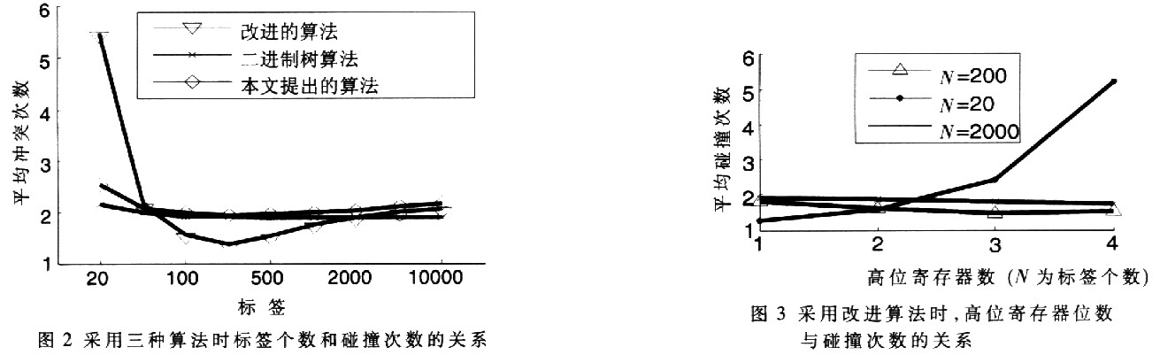 仿真2:為了分析低標(biāo)簽密度時改進(jìn)算法的性能,特設(shè)計以下仿真:采用改進(jìn)算法,分別使用5~8位寄存器。高l~4位為高位,即分群群數(shù)分別為2、4、8和16。仿真結(jié)果如圖3所示,可以看到當(dāng)標(biāo)簽總數(shù)為20時,如果把高位寄存器的位數(shù)從4降到l,則平均碰撞次數(shù)從5 5回落到1.4。而當(dāng)標(biāo)簽總數(shù)為200和2000時,高位寄存器位數(shù)的改變對平均碰撞次數(shù)的影響不大。因此如果在某次仲裁中出現(xiàn)多次空傳,根據(jù)這個先驗知識,讀寫器可以在下一次仲裁時指示標(biāo)簽改變寄存器高位個數(shù),以此降低空傳率,進(jìn)而可以降低平均碰撞次數(shù)。