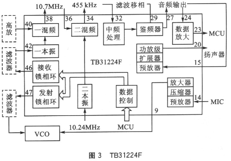 TB31224F的42~46腳配合一個(gè)高頻感容網(wǎng)絡(luò)構(gòu)成第一本振電路,一本振頻率受TB31224F的6~8腳上來(lái)自MCU的鎖相環(huán)數(shù)據(jù)信號(hào)控制。從46腳輸出的鎖相環(huán)控制電壓經(jīng)積分電路后送入4l腳,41腳內(nèi)接變?nèi)荻O管的負(fù)極,變化的控制電壓改變了變?nèi)荻O管結(jié)電容,從而政變一本振頻率。第一本振信號(hào)經(jīng)44腳送入42腳,與內(nèi)部的參考頻率比較而使46腳的控制電壓鎖定,也就鎖定了一本振頻率。第一本振信號(hào)與輸入40腳的外來(lái)信號(hào)混合后從38腳輸出10.7 MHz的第一中頻信號(hào);經(jīng)陶瓷濾波器(10.7 MHz)選頻后送入36腳,與第二本振信號(hào)混合,差頻出455 kHz的第二中頻信號(hào)從34腳輸出;經(jīng)窄帶濾波將純凈的455 kHz信號(hào)送入32腳,再經(jīng)內(nèi)部限幅放大、鑒頻、解調(diào)出復(fù)合音頻信號(hào)(語(yǔ)音和數(shù)據(jù)共用一個(gè)信道)。鑒頻輸出的語(yǔ)音信號(hào)和數(shù)據(jù)信號(hào)從27腳輸出后分兩路進(jìn)行:一路送入24腳放大后,從23腳輸出數(shù)據(jù)信號(hào)RX-DATA送MCU處理;另一路送入15腳,經(jīng)內(nèi)部預(yù)放、擴(kuò)展、放大后從19和20腳輸出語(yǔ)音信號(hào)加至耳機(jī)。