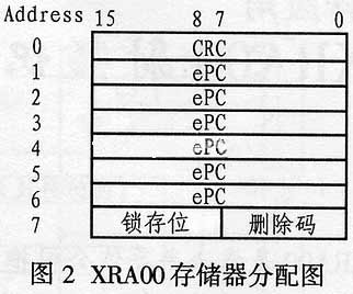 XRA00內(nèi)部的128位存儲器共分八個塊,每塊16位。XRA00的內(nèi)部存儲器映射如圖2所示。讀取時每一位可以單獨讀取,寫入則可按照每塊16位的方式寫入。其中第一個存儲器塊用來存儲ePC規(guī)范定義的CRC(循環(huán)冗余校驗碼),接下來六個塊全都用來存儲庫存序列號中用到的96位產(chǎn)品代碼,最后一塊由8位刪除代碼和8個鎖存位公用,其中8個鎖存位用于保護存儲器里的數(shù)據(jù)。