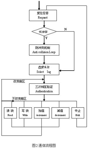 本系統(tǒng)采用M1(MIFARE 1)智能卡,本卡自帶天線,內(nèi)含加密控制邏輯和通訊邏輯電路,M1分為16個(gè)扇區(qū),每個(gè)扇區(qū)為4塊,每塊16個(gè)字節(jié),以塊為存取單位,每個(gè)扇區(qū)有獨(dú)立的一組密碼及訪問(wèn)控制,可一卡多用。M1射頻卡與讀寫器的通信流程圖如圖2所示。